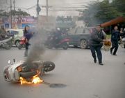Quá sợ hãi, chị Hà bỏ xe, kéo hai con chạy đi khiến xe đổ ra đường, xăng chảy lênh láng và ngọn lửa càng cháy dữ dội.