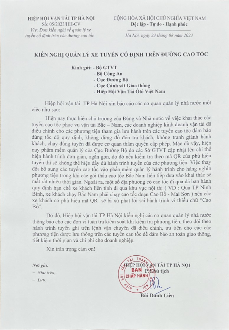 BỘ GTVT TRẢ LỜI KIẾN NGHỊ CỦA HIỆP HỘI VẬN TẢI HÀ NỘI VỀ QUẢN LÝ XE TUYẾN CỐ ĐỊNH TRÊN CÁC ĐƯỜNG CAO TỐC