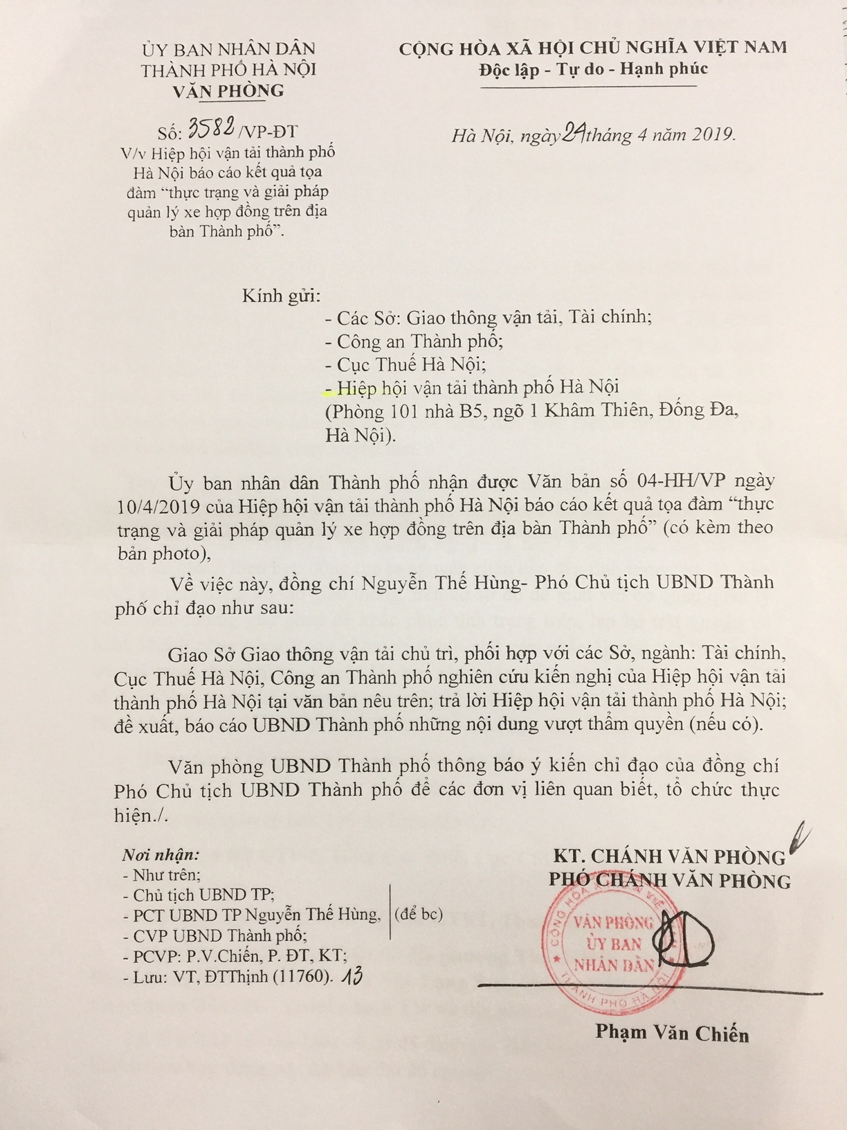 CÔNG VĂN CỦA UBND TP HÀ NỘI THÔNG BÁO Ý KIẾN CHỈ ĐẠO CỦA ĐỒNG CHÍ PHÓ CHỦ TỊCH UBND TP VỀ VIỆC HIỆP HỘI VẬN TẢI TP HÀ NỘI BÁO CÁO KẾT QUẢ TỌA ĐÀM VỀ QUẢN LÝ XE HỢP ĐỒNG