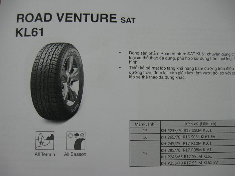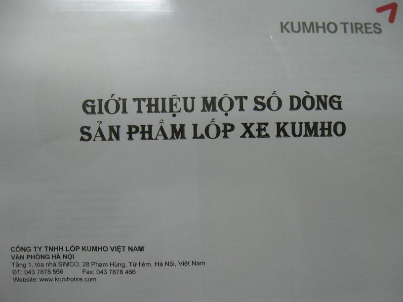 - Tối 26/10/2012: Chủ tịch Hiệp hội dự lễ ra mắt văn phòng đại diện Công ty TNHH Lốp KUMHO tại Hà Nội xin giới thiệu với các doanh nghiệp, hợp tác xã và người kinh doanh một số sản phẩm dòng sản phẩm Lốp KUMHO như sau