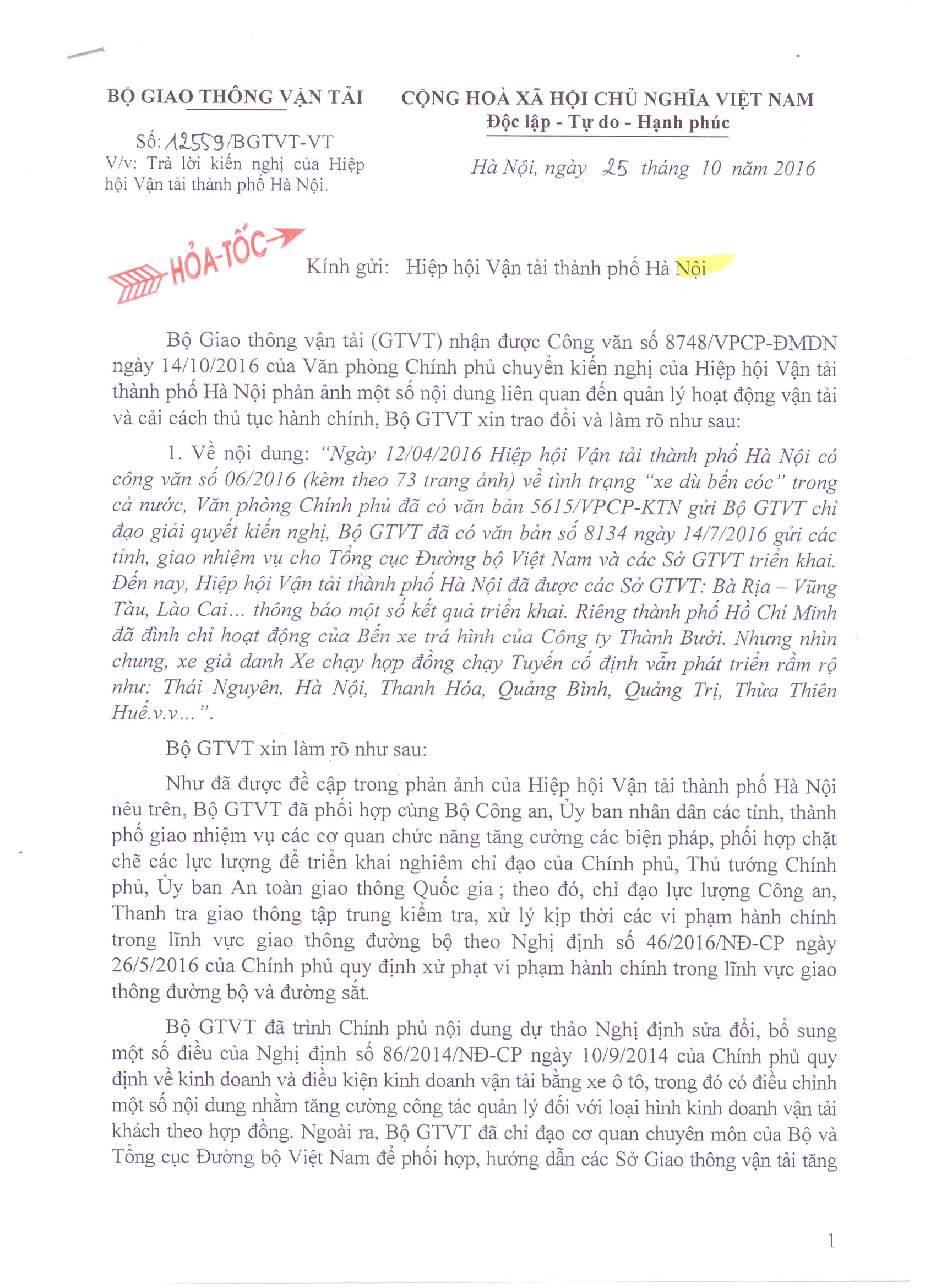 BỘ GTVT TRẢ LỜI KIẾN NGHỊ CỦA HIỆP HỘI VẬN TẢI HÀ NỘI VỀ QUẢN LÝ XE TUYẾN CỐ ĐỊNH TRÊN CÁC ĐƯỜNG CAO TỐC