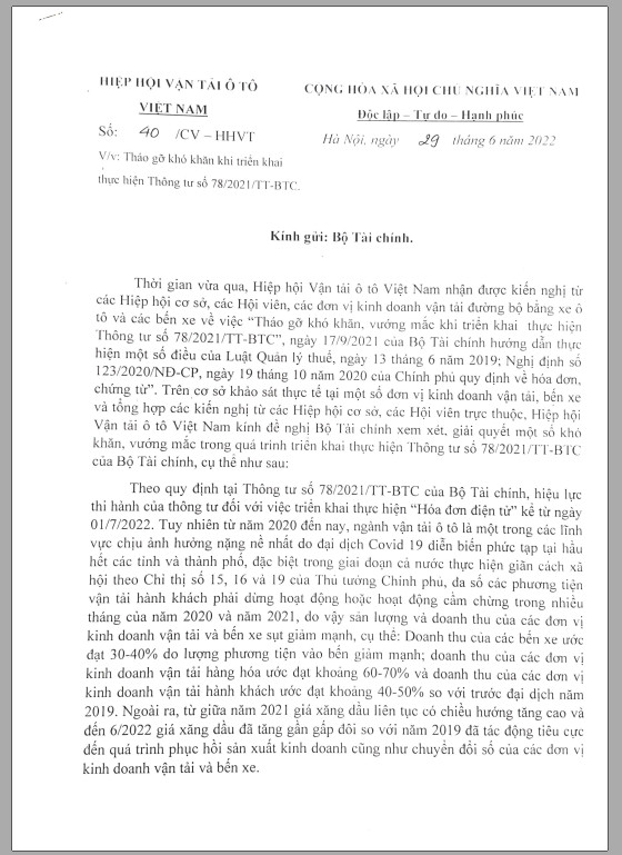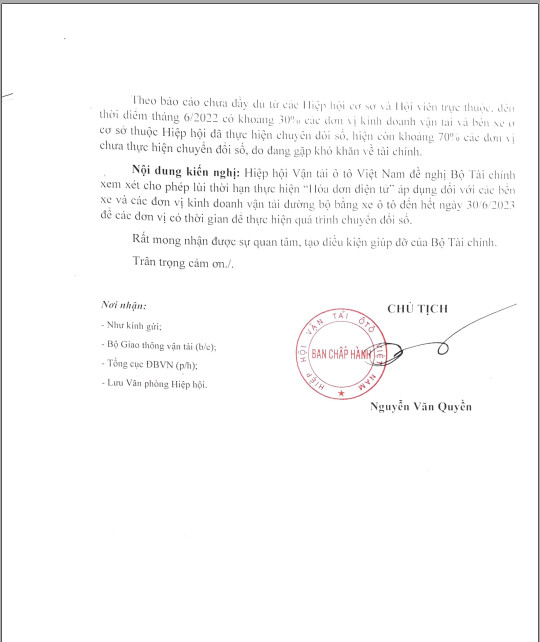 CÔNG VĂN XIN LÙI THỜI HẠN ÁP DỤNG HÓA ĐƠN ĐIỆN TỬ ĐỐI VỚI BẾN XE VÀ DOANH NGHIỆP VẬN TẢI CỦA HIỆP HỘI VẬN TẢI Ô TÔ VIỆT NAM