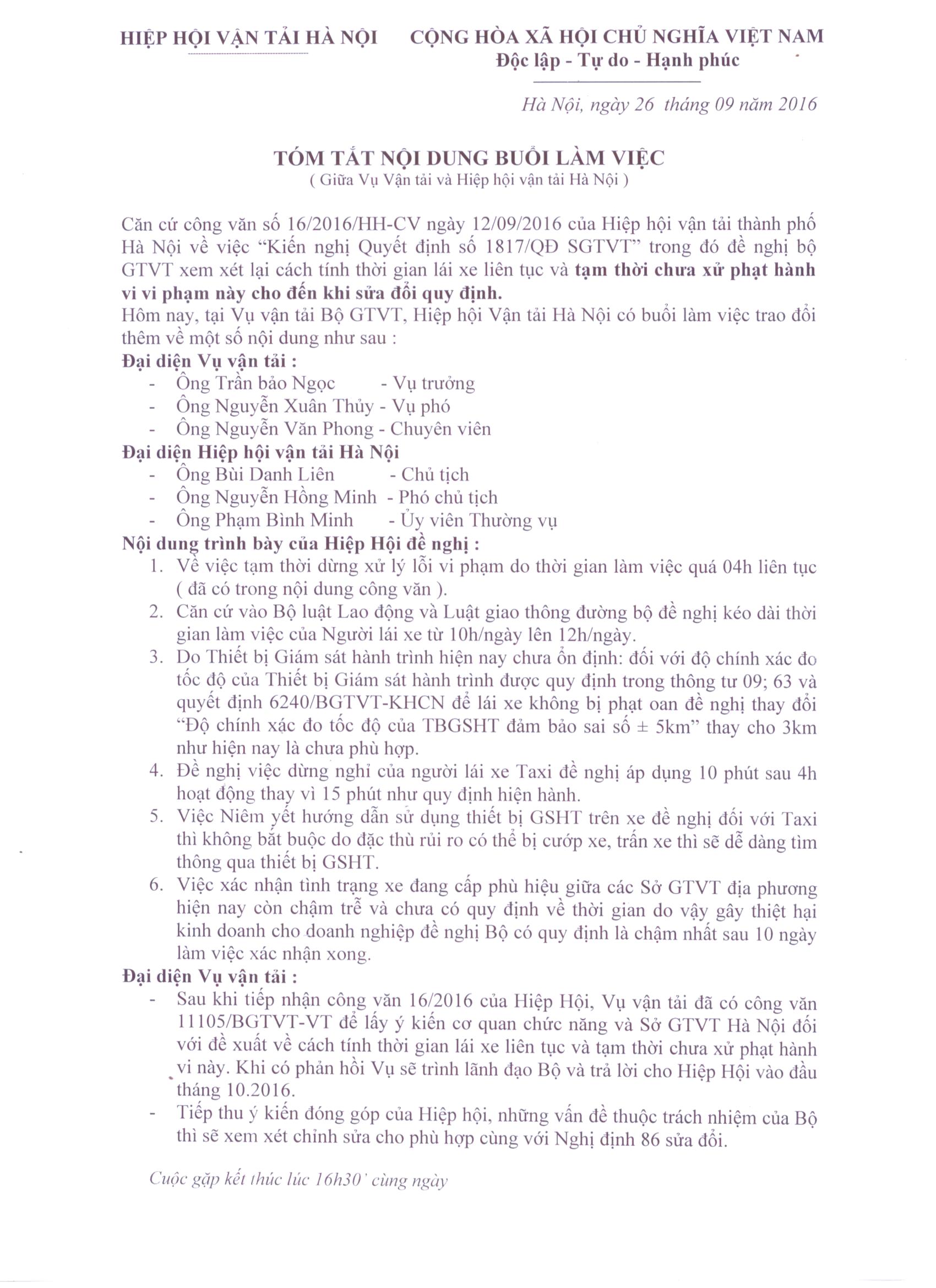 NỘI DUNG BUỔI LÀM VIỆC GIỮA VỤ VẬN TẢI VÀ HIỆP HỘI VẬN TẢI HÀ NỘI VỀ CÁCH TÍNH THỜI GIAN LÁI XE LIÊN TỤC VÀ TẠM THỜI CHƯA XỬ PHẠT HÀNH VI VI PHẠM NÀY.