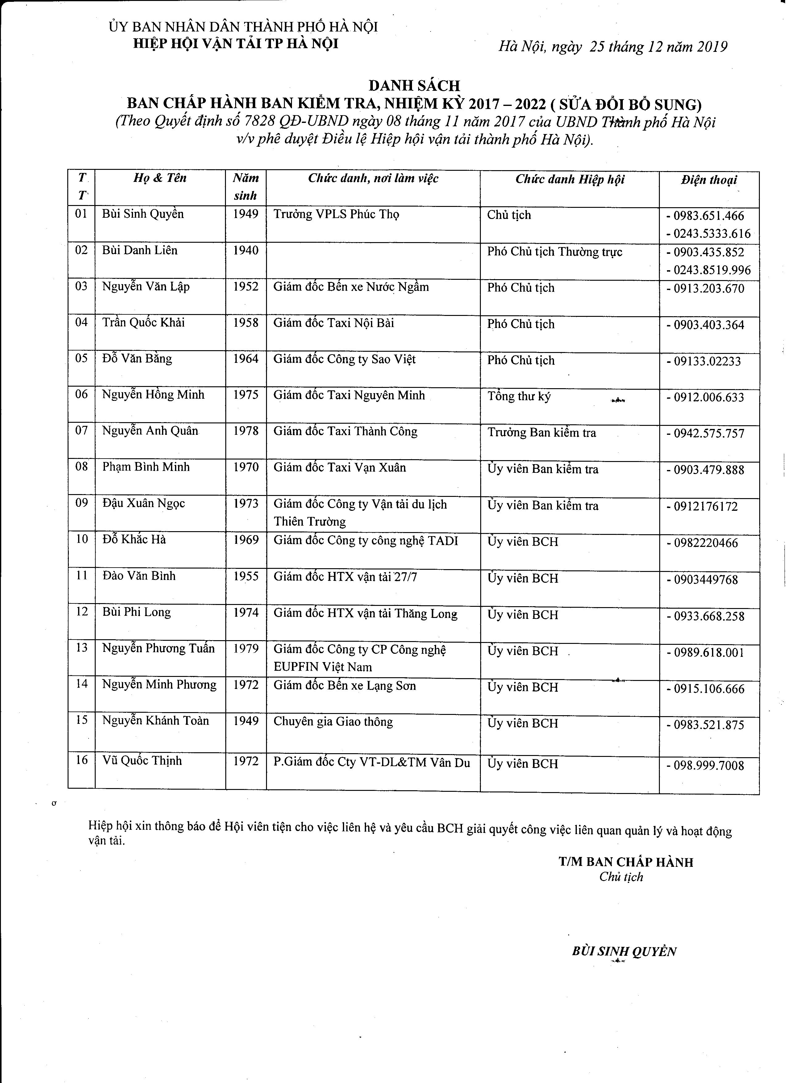 - Sở GTVT; - Sở Nội vụ; - MTTQ TP Hà Nội; - Các ủy viên BCH.