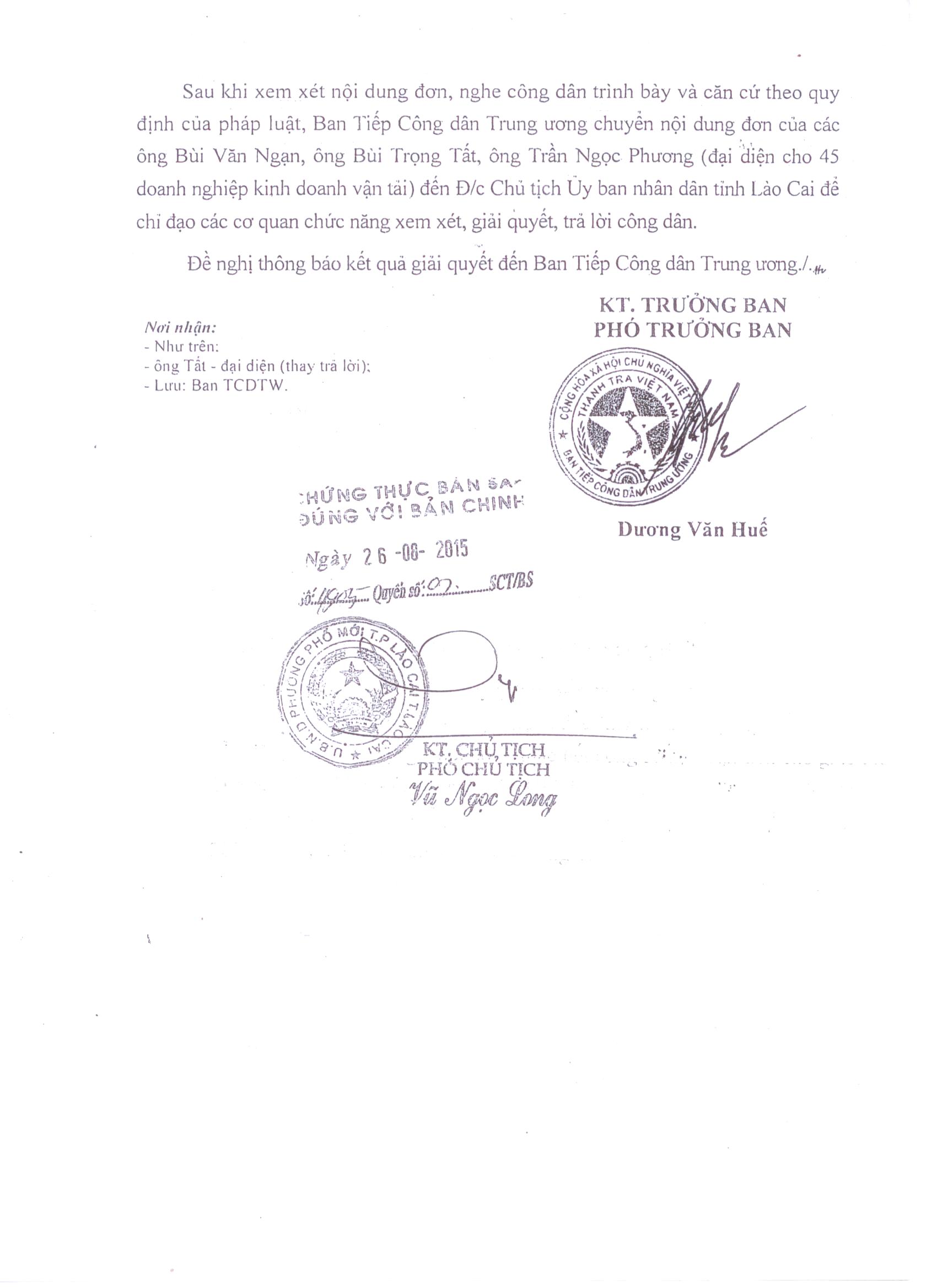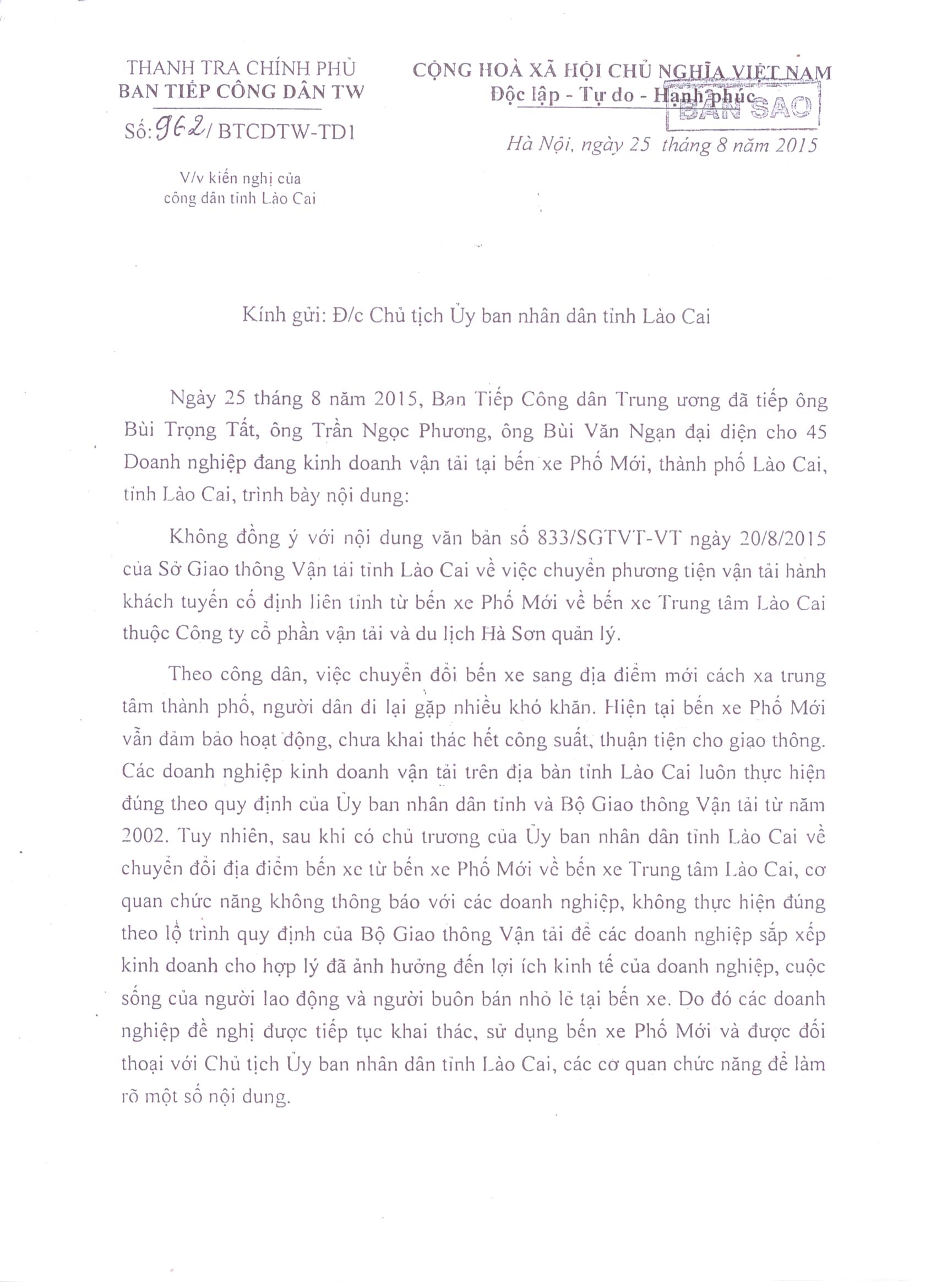 BAN TIẾP CÔNG DÂN TW CHUYỂN Ý KIẾN TỚI UBND TỈNH LÀO CAI VỀ VIỆC DI DỜI BẾN XE LÀO CAI