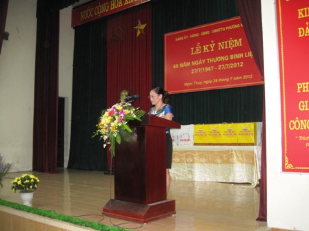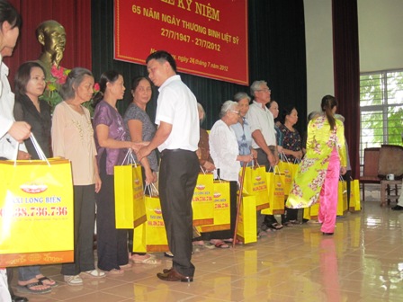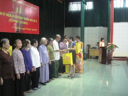 Bà Nguyễn Thị Thanh Thủy - Giám Đốc Cty trao quà tặng cho Mẹ liệt sĩ, gia đình thương binh tại phường Thạch Bàn.